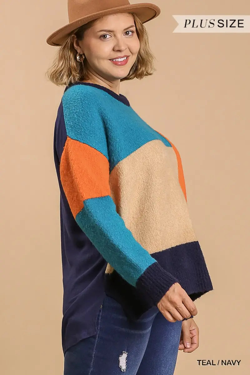 Teal And Navy Colorblock Contrasted Cotton Fabric on Back Top with Side Slits and High Low Hem. Relaxed Fit.