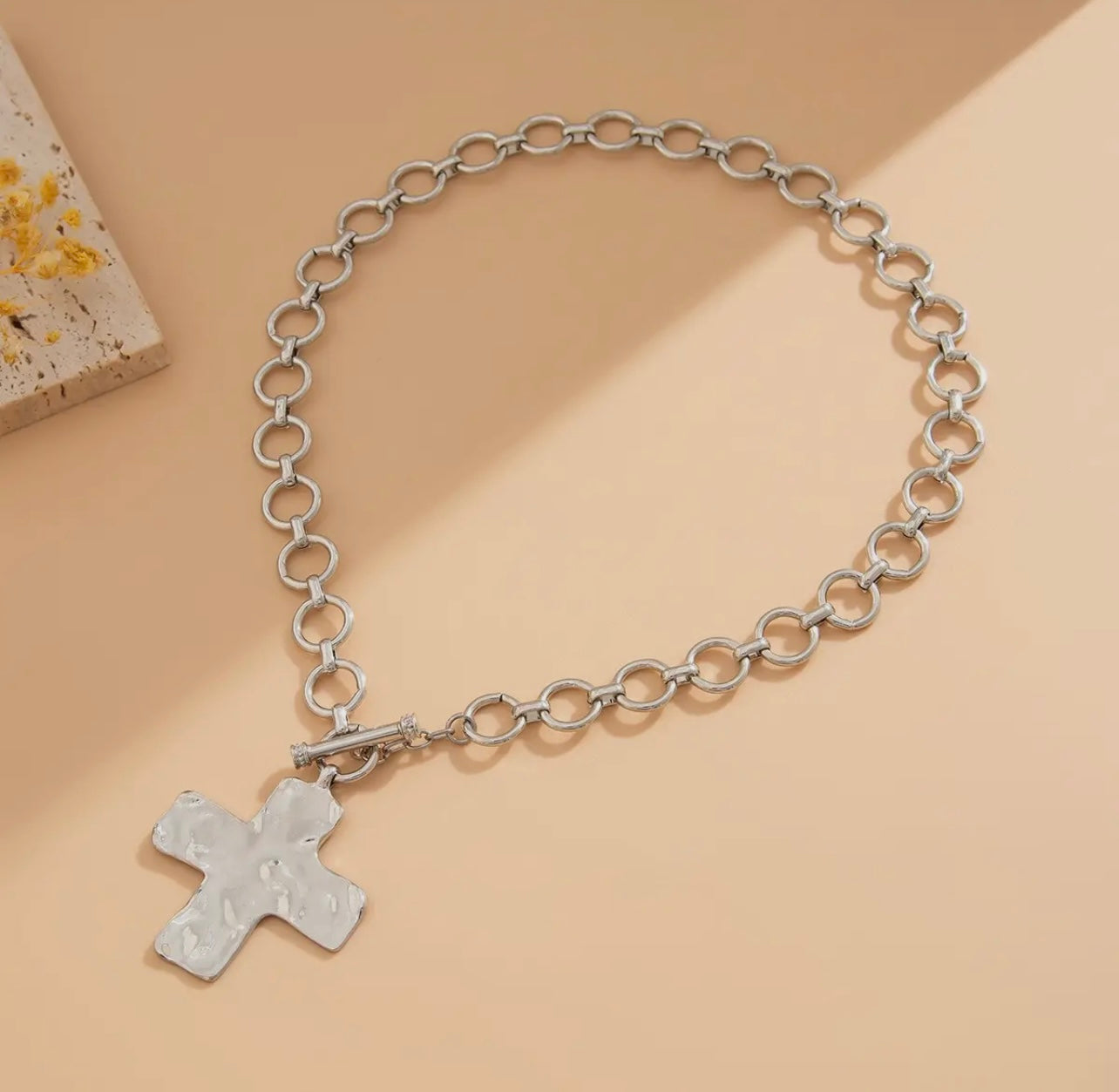 Notable Hammered Cross Front Toggle Necklace. Gold Plated. Lead & Nickel Compliant. Double E-Coating. Available In Colors Gold or Silver