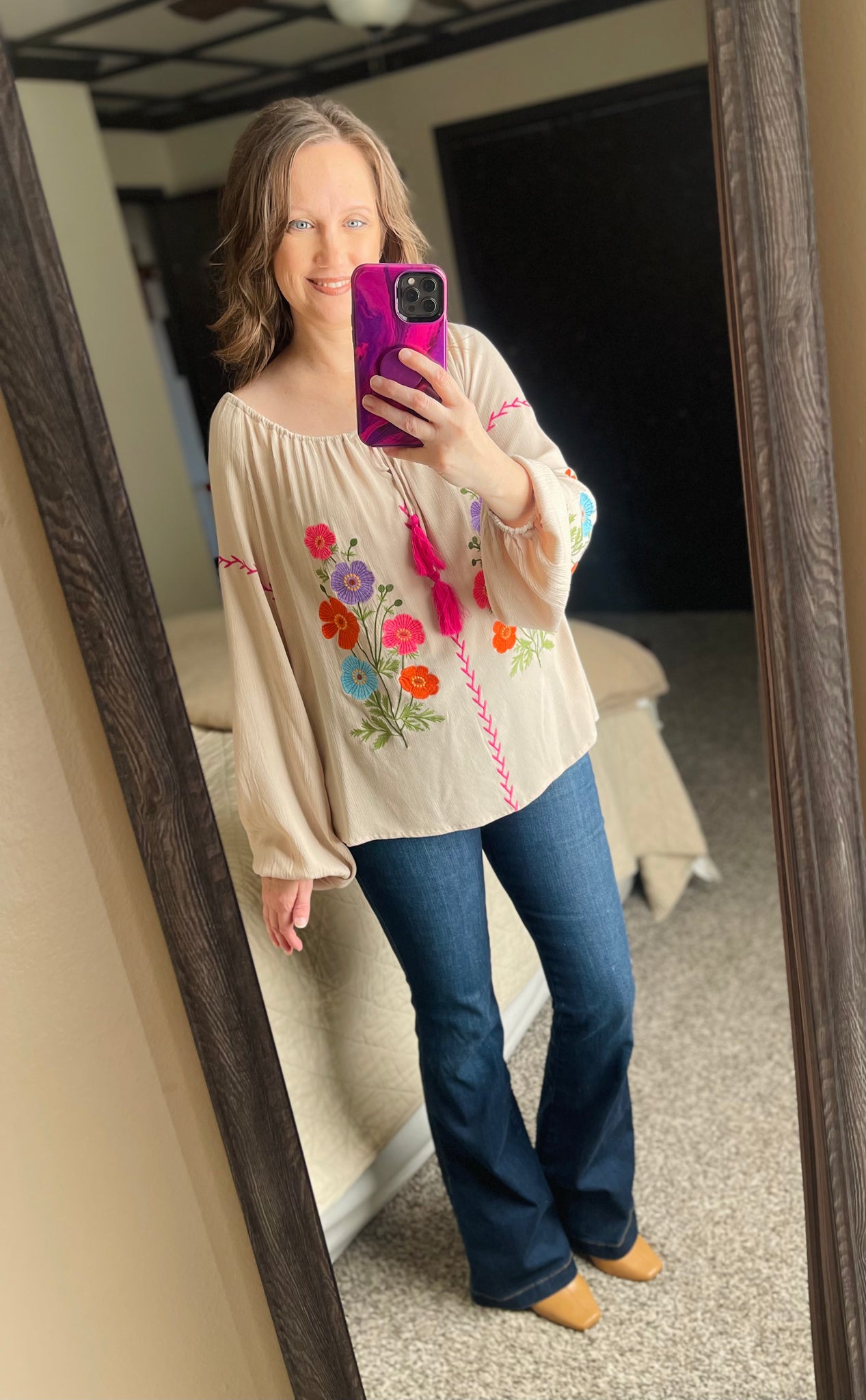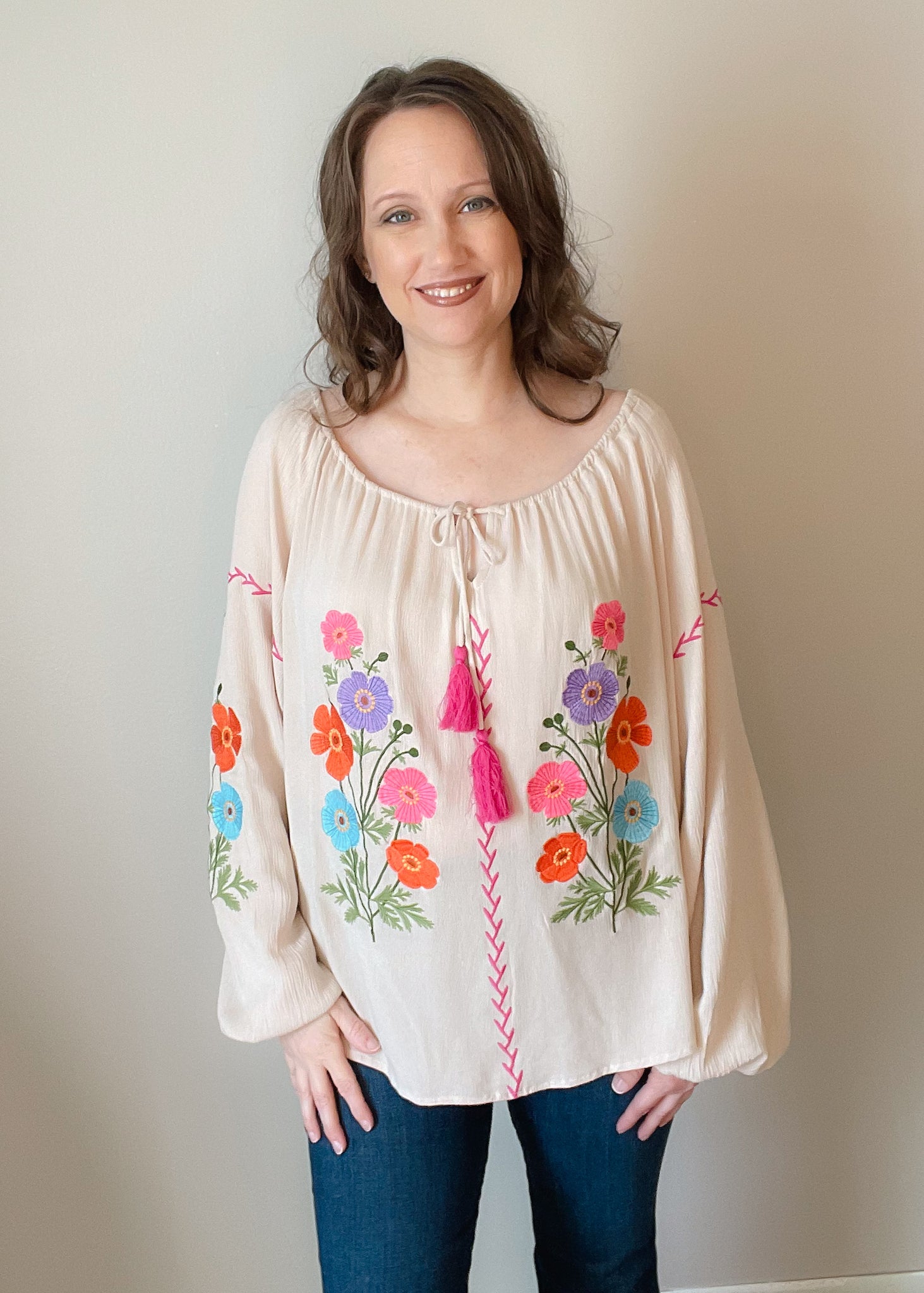Floral Embroidered Rayon Gauze Babydoll Top. Long Bubble Sleeves.  Rounded Cut Neckline.  Adjustable Tassel Tie On Neck.  Ruched Neckline Detailing.  Dropped Shoulders.  Elastic Cuffs.  Lightweight.  Relaxed and Loose Fit.  Shown in a Small