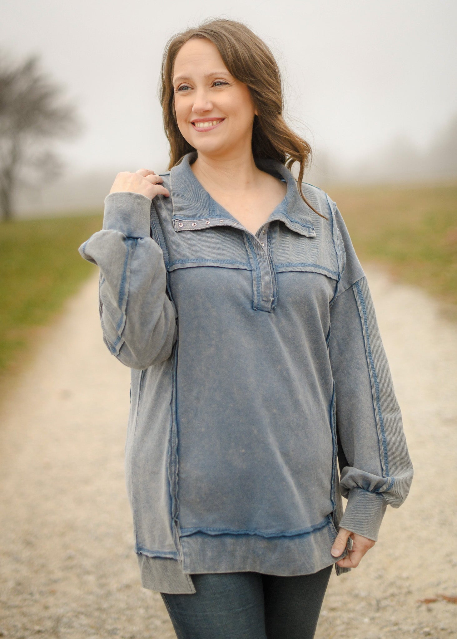 Denim Blue Half Button Down Casual Contrast Knit Top.  Mock Neck.  Drop Shoulder. Raw Edge Detail with Front Slit.  Slightly Oversized.  Shown in a Medium.